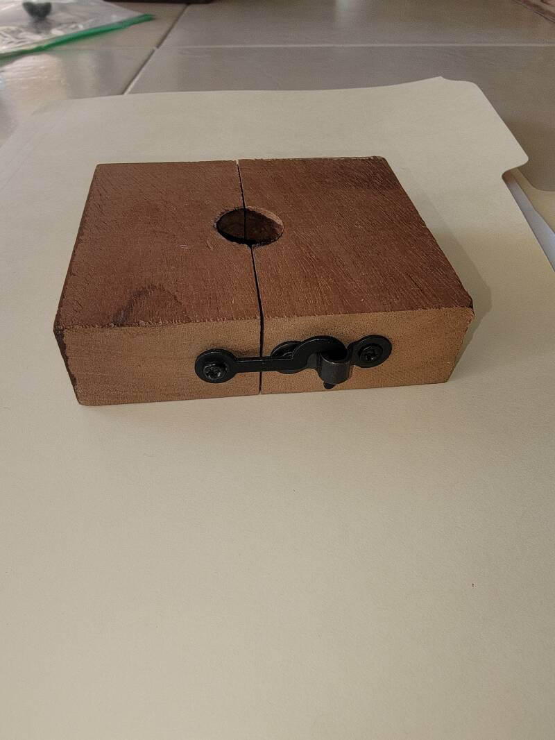 Have you ever brought home some flowers for your wife, friend or family member, only to find them drooping far sooner than expected? Living in the Southern US, we often had HUGE, beautiful Magnolia trees nearby. At a special time of the year, they begin to go into a bloom cycle and, often, some of the blooms fall off or sometimes the blooms are removed carefully from the tree. In either case, when taking them into our home, my wife or sometimes myself, would place them in a drinking glass or vase, whatever was handy! Often times, after a short period, due to the configuration of the stem and the weight of the bloom (Magnolia blooms can be HUGE!), they would begin to "droop" rather than standing loud and proud and we both absolutely LOVE the scent of Magnolia blooms! One day I decided to try to rectify that situation and I developed a very simple, but also very efficient, way to keep the blooms standing tall! It took very little of my time and I was able to use scrap wood to create what I hoped was the cure for the common droop! I used a scrap piece of true Mahogany and a small hinge with matching clasp/latch that I had left over from earlier projects. As you can see, it is pretty simple and straight forward. Bore hole, cut block in half, install hinge on one side, clasp/latch on opposite side, place on top of glass or vase. open the block to place stem through the center then close the block and secure the clasp/latch! Pretty simple and works GREAT! Okay, sorry I got a little long winded so I'll move on for now, but I'll be checking back real soon! Until then...wishing you all a fun Spring and hoping we all can enjoy some nice, warm weather!!!